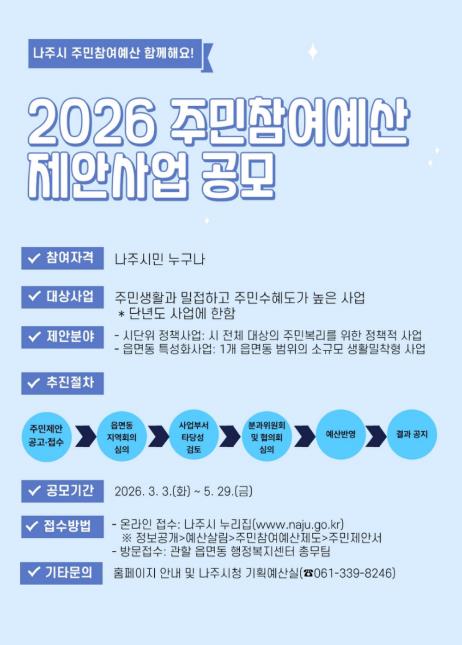 ![]() 나주시 주민참여예산 제안사업 공모 안내 포스터. (사진 제공-나주시) |
