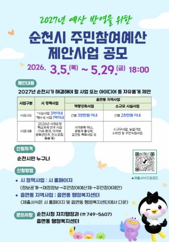 ![]() 순천시, 2027년 예산편성을 위한 주민참여예산 제안 접수 |