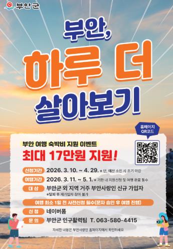 군 관계자는 “이번 이벤트는 관광객이 부안의 자연과 먹거리, 체험 콘텐츠를 충분히 경험하도록 돕는 체류 확대 정책”이라며 “부안을 찾은 방문객이 다시 찾고 싶은 도시로 기억될 수 있도록 체류형 관광 정책을 지속적으로 강화하겠다”고 말했다.