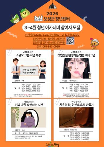 ![]() 보성군 청년센터, 3월~4월 프로그램 참가자 3월 13일까지 모집_3~4월 청년 아카데미 참여자 모집 홍보물 |