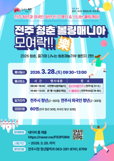 시는 오는 28일 오전 9시 30분, 전주지역 청년과 전주에서 거주하는 외국인 청년 등 60여 명이 함께하는 ‘청춘 볼링매니아 모여락(樂)!’ 행사를 개최한다.