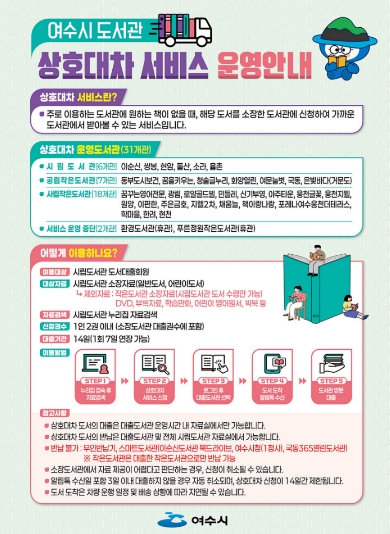 ![]() 여수시 도서관 ‘상호대차 서비스 운영안내’ 포스터 |