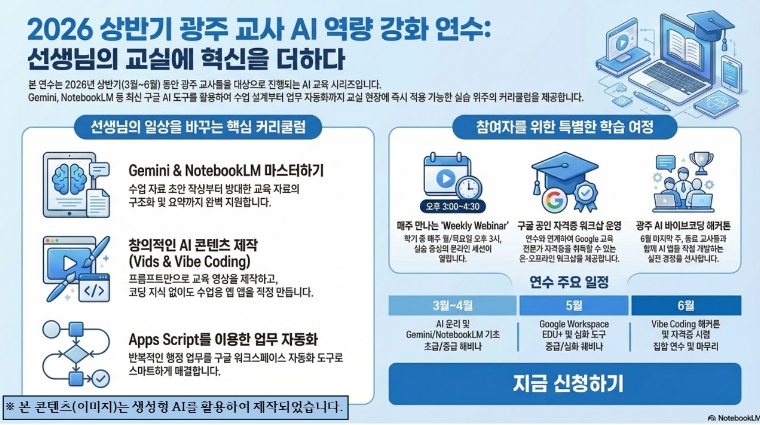 ![]() [포스터] 광주시교육청, 생성형 AI 활용 ‘맞춤형 교원 연수’ 운영 |