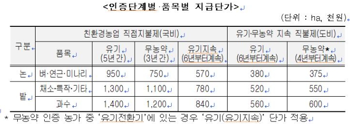 무농약은 3년(3회), 유기는 5년(5회) 인증단계별·품목별 지급단가는 ha당 유기농은 95만원~140만원, 무농약은 75~120만원으로 지급된다. 또한 저농약 지급 이력은 제외하여 친환경 인증 농가의 직불금 수혜 기회를 확대했다.