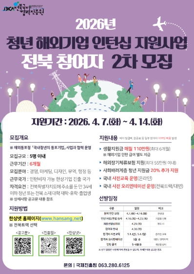 ![]() (포스터)‘해외에서 시작하는 첫 커리어’ 전북 청년 인턴십 2차 모집 |
