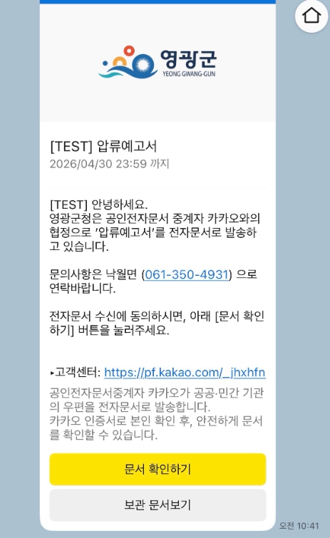 이번 압류예고서 발송은 기존 카카오 알림톡 체납안내문 운영 성과를 바탕으로 추진된 것으로, 체납 사실을 신속하게 안내하여 자진 납부를 유도하고 징수업무의 효율성을 높이기 위해 시행됐다.
