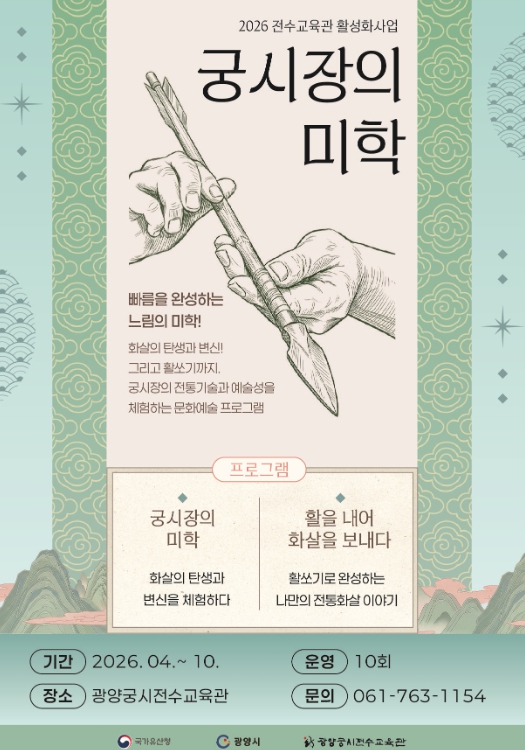 김철호 광양궁시전수교육관장은 “이번 사업을 통해 시민들이 우리 지역의 소중한 무형유산을 가까이에서 보고 체험할 수 있도록 다양한 프로그램을 준비했다”며 “전통 궁시 문화의 가치가 다음 세대로 이어질 수 있도록 교육과 체험 기회를 꾸준히 마련하겠다”고 말했다.