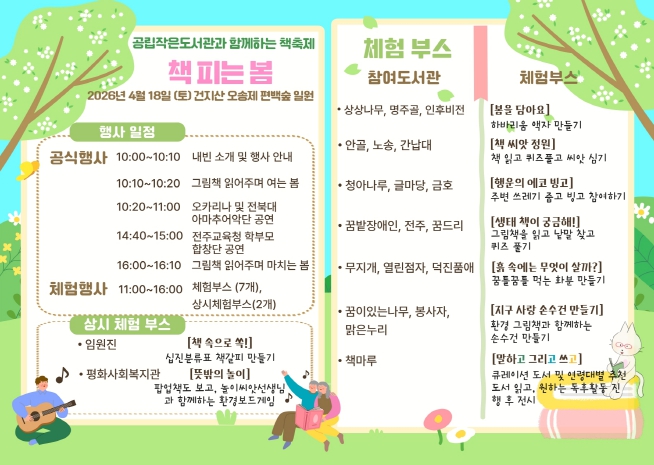주요 프로그램은 △그림책 읽어주기 △오카리나 및 전북대학교 아마추어 오케스트라의 ‘악기 연주’ △전주교육청 학부모 합창단의 ‘합창 공연’ 등으로, 행사장을 찾은 시민들에게 봄날의 정취를 선사하게 된다.