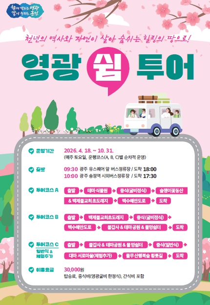 금년에는 체험 프로그램을 더해 더욱 다채로워진 3개의 코스로 광주 유스퀘어, 송정역에서 출발할 예정이며 A코스는 ▲테마식물원▲ 숲쟁이 꽃동산▲백제불교 최초도래지▲백수해안도로, B코스는 ▲백제불교최초도래지▲숲쟁이꽃동산▲백수해안도로▲불갑사·테마공원·물멍쉼터, C코스는 ▲불갑사▲물무산 행복숲 황톳길▲대마 서로마을 체험 프로그램으로 구성된다.