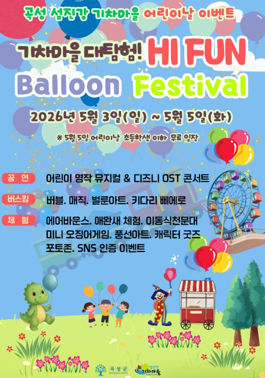 한편, 어린이날을 맞아 섬진강기차마을에서 펼쳐지는 ‘기차마을 대탐험! Hi Fun Balloon Festival’은 어린이 뮤지컬, 디즈니 OST 콘서트, 매직 일루전 쇼, DJ 랜덤댄스 공연 등이 준비돼 축제 분위기를 한층 끌어올리고, 행사 기간 동안 마술쇼, 버블쇼, 벌룬아트, 키다리 삐에로 등 참여형 버스킹 공연도 상시 운영된다.
