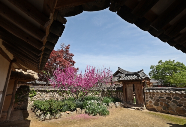 나지막한 돌담 너머로 피어난 봄꽃과 단아한 한옥의 부드러운 곡선이 자연스럽게 조화를 이루며 고택 특유의 평온하고 여유로운 분위기를 자아낸다.