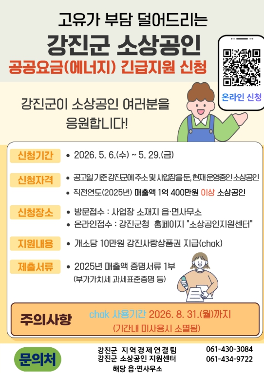 지원 대상은 공고일 기준 강진군 내에서 대표자 주민등록 주소 및 사업장을 운영 중인 소상공인으로, 직전 연도(2025년) 매출액이 1억 4백만 원 이상인 업체다.