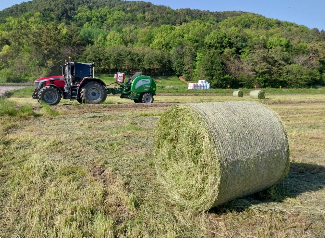 ![]() 이탈리안라이그라스를 수확해 사일리지용 롤을 제작하는 모습 |