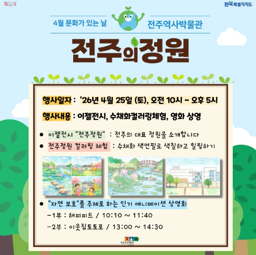 구체적으로 박물관 1층 교육체험실에서는 ‘전주정원’을 주제로 한 수채화 컬러링 체험이 진행되고, 1층 로비에서는 전주정원을 소개하고 그 소중함을 알리는 이젤 전시가 진행됐다. 또, 박물관 지하 1층 강당에서는 자연 보호를 주제로 하는 애니메이션이 상영됐다.