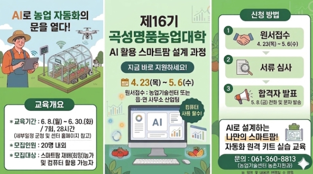 ![]() 제16기 곡성명품농업대학 AI 활용 스마트팜 설계 과정 모집 안내문 |