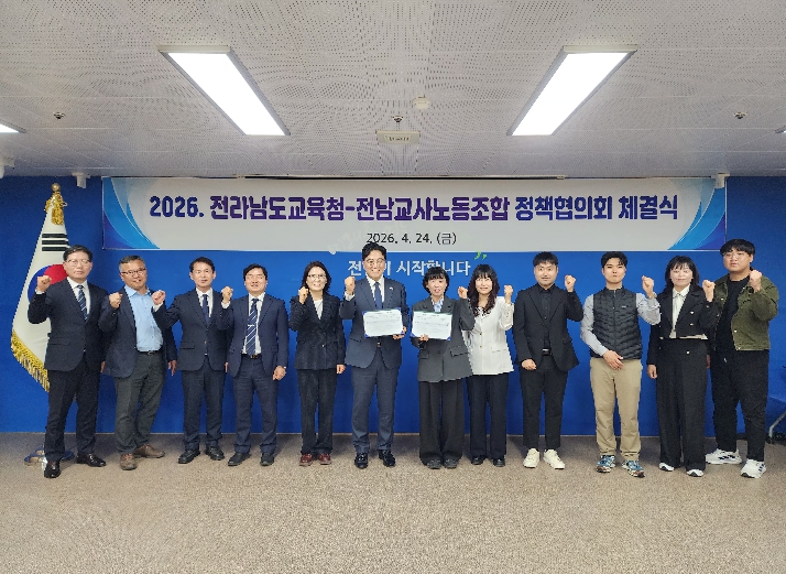 ![]() 남교육청과 전남교사노조 관계자들이 24일 전라남도교육청에서 ‘2026년 정책협의회 체결식’을 마친 뒤, 기념사진 촬영을 하고 있다. |