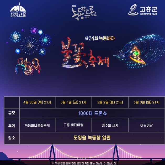 고흥군은 강우, 강풍 등 기상 여건에 따라 드론쇼 일정이 변경될 수 있으므로, 방문 전 녹동항 드론쇼 홈페이지 또는 인스타그램을 통해 공연 일정을 꼭 확인할 것을 당부했다.