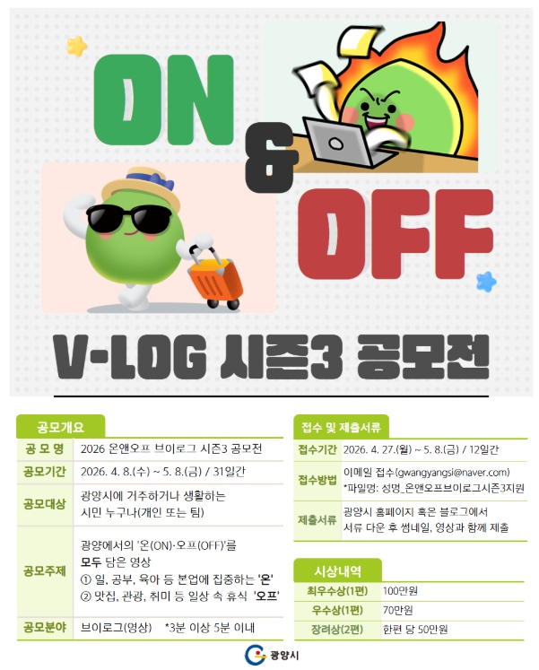![]() 광양시, ‘2026 온앤오프 브이로그 시즌3 공모전’ 접수 |