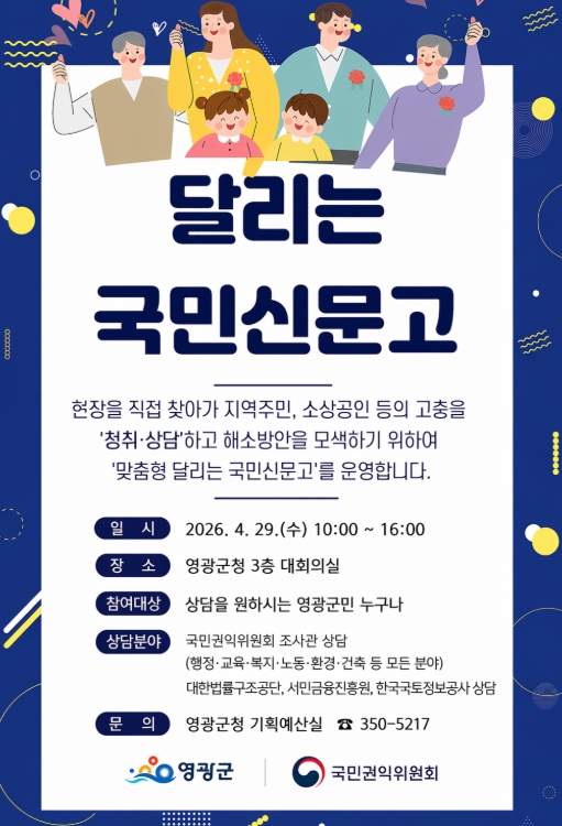 한편, 이번 상담은 별도의 사전 예약 없이도 참여 가능하며, 상담을 원하는 군민은 행사 당일 영광군청 3층 대회의실을 방문하면 된다.