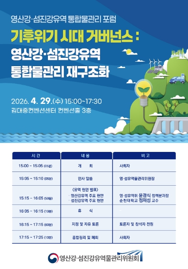 김민환 영산강ㆍ섬진강유역물관리위원회 민간위원장은 “기후위기가 심화되는 상황에서 통합물관리 재구조화는 더 이상 미룰 수 없는 과제”라며 “이번 포럼을 시작으로 현장의 목소리를 폭넓게 수렴하고, 실효성 있는 통합물관리 방안을 함께 만들어 나가겠다”고 밝혔다.