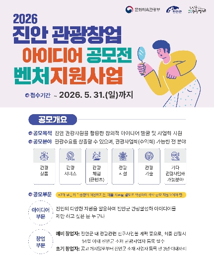 ![]() (사)진안군관광협의회,‘2026 진안 관광창업 아이디어 공모전’개최 |