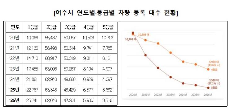 ![]() 여수시 연도별·등급별 차량 등록 대수 현황 |