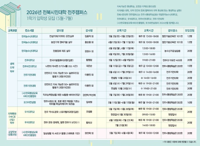 이번 1학기 교육은 오는 5월부터 7월까지 각 과정별로 지정된 교육 장소(각 대학 및 전주시평생학습관 등)에서 진행된다.
