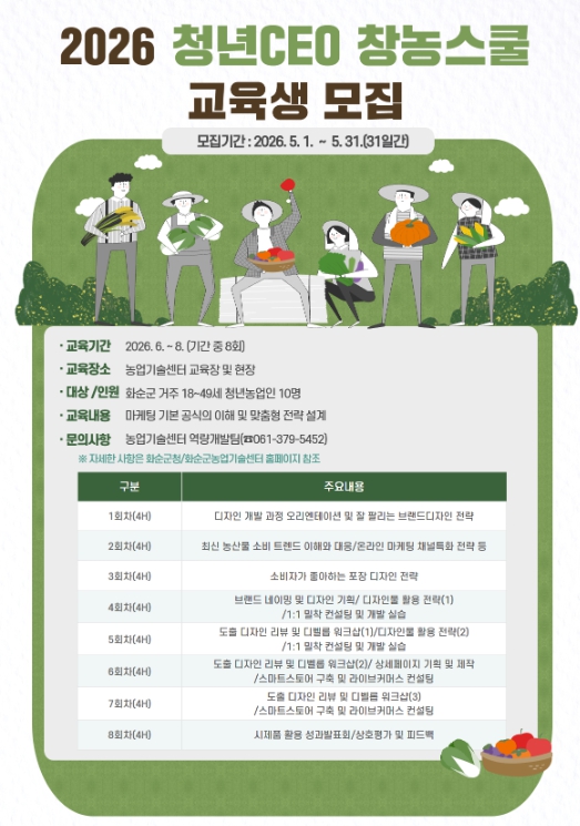 신청 기간은 5월 31일까지이며, 화순군농업기술센터 홈페이지 공고를 참고해 농업기술센터 역량개발팀에 방문하거나 이메일로 신청서를 제출하면 된다.
