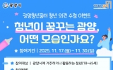 광양 박인석 기자2025. 11.17[뉴스채널]광양청년꿈터가 11월 17일부터 11월 30일까지 ‘청년이 꿈꾸는 광양, 어떤 모습인가요?’를 주제로 청년 의견 수렴 이벤트를 진행한다. 이번 이벤트는 광양시 청년들의 다양한 목소리를 듣고, 청년이 바라는 광양의 미래상을 향후 청년정책과 프로그램 운영에 반영하기 위해 마련됐다. 참여 대상은 광양시에 거주하거나 광양시에서 활동하고 있는 18세~45세 이하 청년이다. 참여 방법은 광양청년꿈터 공식 SNS(네이버 블로그·인스타그램) 중 한 곳을 팔로우한 뒤, ‘청년이 바라는 광양의 모습’을 자유롭게 작성해 팔로우 인증...