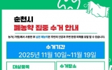 화순 박인석 기자2025. 11.06[뉴스채널]순천시는 농가와 가정에서 사용 후 남은 폐농약과 유효기간이 지난 농약을 안전하게 수거하기 위해 폐농약 집중수거 기간을 운영한다고 밝혔다. 집중수거 기간은 오는 10일부터 19일까지이며, 수거는 읍・면 행정복지센터와 순천시 업사이클센터 더새롬에서 수거가 진행된다. 농민과 시민은 가까운 수거장소를 이용해 폐농약을 안전하게 배출할 수 있다. 이번 사업은 농가에 방치되기 쉬운 폐농약을 체계적으로 수거・처리해 환경오염을 예방하고 시민 안전을 강화하는 데 목적이 있다. 수거된 폐농약은 폐기물 전문처리업체를 통해 안전하게 처리...