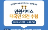 순창 박인석 기자2026. 04.09[AI 호남뉴스]광주시교육청은 민원서비스 품질 향상을 위해 오는 9~20일 국민권익위원회 온라인 정책참여 플랫폼 ‘국민생각함’과 ‘시교육청 누리집’을 통해 대국민 의견을 수렴한다. 이번 의견 수렴은 국민의 다양한 목소리를 민원행정과 제도개선에 반영해 광주교육 민원서비스 만족도를 높이기 위해 추진됐다. 의견 수렴 내용은 ▲민원서비스 향상을 위한 제도 개선 ▲민원실 편의시설 및 환경 개선 ▲기타 민원서비스 이용 시 불편사항 및 개선 아이디어 등이다. 지난해 실시한 ‘2025년 민원서비스 개선 대국민 의견수렴’에는 595명의 국민...