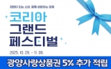 광양 박인석 기자2025. 10.29[뉴스채널]광양시는 전국 단위 소비진작 행사인 ‘코리아 그랜드 페스티벌(Korea Grand Festival)’ 기간(2025. 10. 29.~11. 9.) 동안 광양사랑상품권 할인율을 한시적으로 18%로 상향한다고 밝혔다. ‘코리아 그랜드 페스티벌’은 국무조정실, 기획재정부, 행정안전부, 산업통상자원부와 행정안전부, 문화체육관광부 등 관계 부처가 공동으로 추진하는 국가대표 소비축제다. 행사 기간에는 △지역사랑상품권 및 디지털온누리상품권 특별할인 △상생소비복권 (20억 원 규모) 신규 시행 △농·축·수산물·생필품 특별할인 △숙...