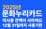 광주광역시 박인석 기자2025. 12.07[AI 호남뉴스]광주문화재단은 2025년 문화누리카드 사용기한이 12월 31일까지이며, 미사용 지원금은 자동 소멸한다고 밝혔다. 특히 연말까지 3만 원 이상 사용하지 않을 경우, 내년 자동 재충전 대상에서 제외될 수 있어 이용자의 주의가 필요하다. 올해 문화누리카드 지원금은 1인당 14만 원으로, 도서·영화·공연·테마파크·시외버스·KTX·체육시설·스포츠 용품·스포츠 관람·캠핑용품 등 다양한 분야에서 사용할 수 있다. 문화누리카드는 지역 축제에서도 활용할 수 있다. 올해 마지막 연계 축제인 ‘빛고을 사랑나눔 김장대전’에서는 김장...