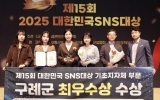 해남 박인석 기자2025. 10.16[뉴스채널]전남 구례군이 10월 16일, 한국프레스센터 국제회의장에서 열린 ‘제15회 2025 대한민국 SNS대상’시상식에서 기초지자체(군) 부문 최우수상을 수상했다. 대한민국 SNS대상은 (사)한국소셜콘텐츠진흥협회가 주최하며 공공기관과 기업의 소셜미디어 운영 우수 사례를 선정해 시상하는 국내 대표 SNS 관련 어워즈다. 구례군은 유튜브, 인스타그램, 페이스북, 블로그, 카카오톡 채널 등 다양한 SNS 플랫폼을 활용해 군정 소식을 효과적으로 알리고, 군민 및 외부와의 소통을 강화한 점이 높은 평가를 받았다. 특히, 유튜브 숏츠...