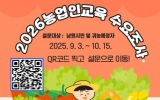 남원 박인석 기자2025. 09.12[뉴스채널]남원시농업기술센터는 농업인의 교육 수요를 반영한 2026년 농업인교육프로그램을 개발·운영하기 위해 『2026년 농업인 교육을 위한 설문조사』를 실시한다. 이번 설문조사는 지역 농업인 및 귀농 귀촌인의 관심분야, 영농 애로사항, 희망 교육 주제 및 품목 등을 파악하여 현장 중심의 맞춤형 교육과정을 편성하는 데 활용될 예정이다. 설문조사는 9월 3일부터 10월 15일까지 43일간 진행되며 ▲남원시 대표 누리집 공지사항 ▲온라인 네이버폼 ▲서면작성 ▲남원시농업기술센터 누리집 ▲농업인 단체를 통한 배부 등으로 다양하게 운...