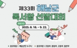 장흥 박인석 기자2025. 09.04[뉴스채널]해남군립도서관은 지역 주민의 독서 활동을 장려하고 책 읽는 문화 확산을 위해 제33회 해남군 독서왕 선발대회를 개최한다. 이번 대회는 초등부, 중등부, 고등부, 일반부로 나뉘어 진행된다. 참가자는 전라남도립도서관 및 해남군립도서관에서 선정한 2025 올해의 책 8권 중 부문에 맞게 도서를 읽고 독후감을 작성해 제출하면 된다. 올해의 책 목록은 다음과 같다 ▲일반 '고통 구경하는 사회' '나는 다정한 관찰자가 되기로 했다' '여기는 괜찮아요' '작은 빛을 따라서' ▲청소년 '열다섯에 곰이라니' '율의 시선' ▲어린이 '...