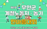 무안 박인석 기자2025. 08.20[뉴스채널]전남 무안군 따르면, 오는 29일 스포츠파크 실내체육관에서 ‘제2회 무안군 계절노동자·농가 한마음대회’가 개최된다. 이번 행사는 필리핀, 라오스, 베트남 등지에서 온 외국인 계절노동자와 지역 농가, 결혼이민자가 소통하고 화합하는 자리로, 외국인계절노동자 무안군연합회(회장 강행원)가 주최하고 무안군 가족센터와 무안군 마을관리 사회적협동조합이 협업해 준비했다. 세부 프로그램은 관내 상가 음식을 활용한 먹거리와 ▲오징어게임의 명랑운동회, ▲외국인 계절노동자와 지역 농가 소통의 시간, ▲K팝 EDM 파티 등으로 참여자 간 유...
