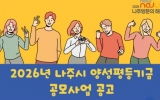 전라남도 박인석 기자2026. 03.19[AI 호남뉴스]전남 나주시가 일·생활 균형과 양성평등 문화 확산, 돌봄과 안전 복지 지원을 위한 ‘2026년 나주시 양성평등기금 공모사업’을 추진한다. 19일 나주시에 따르면 이번 공모사업은 일자리 창출과 일·생활 균형, 양성평등 문화 확산, 돌봄·안전·복지 지원, 지역특화사업 등 총 4개 분야를 대상으로 진행된다. 올해 지원 규모는 4천만 원으로 사업 내용과 예산 편성에 따라 사업별 최대 1천만 원까지 지원하며 단체별 1개 사업에 한해 신청할 수 있다. 신청 자격은 공고일 기준 나주시에 주소를 두고 있는 비영리법인 또는 비...