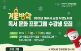 여수 박인석 기자2025. 12.31[AI 호남뉴스]여수시가 운영하는 5개 공립 작은도서관에서 오는 2026년 1월 5일부터 8일까지 ‘겨울방학 독서문화 프로그램’ 수강생 106명을 선착순 모집한다. 이번 프로그램은 방학을 맞아 학생과 성인을 대상으로 독서를 통해 창의력·사고력을 증진하기 위한 다양한 독서문화 프로그램으로 마련됐다. 운영 기간은 오는 2026년 1월 12일부터 2월 24일까지며 프로그램별 기간이 다르다. 운영 작은도서관은 ▲여문늘벗(구 중부보건지소) ▲꿈을키우는(미평 선경 3차 아파트) ▲화양열린(화양면민회관 2층) ▲청솔글누리(돌산 청솔 2차 아...