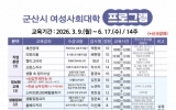 군산 박인석 기자2026. 02.20[AI 호남뉴스]군산시 여성사회대학이 오는 2월 24일부터 27일까지 상반기 프로그램 수강생을 선착순 모집한다. 이번 프로그램은 ▲직업훈련 교육(패션양재 등 5개) ▲정보화 교육(손쉽게 배우는 AI 등 3개) ▲생활문화 교육(생활집밥요리 등 2개) ▲교양 교육(보태니컬아트와 색연필화 등 13개) ▲건강 교육(요가 등 5개) ▲야간 교육(통기타초급 등 3개) 분야별 총 31개 강좌가 운영되며, 손쉽게 배우는 AI 등 19개 강좌는 남성 회원도 참여할 수 있다. 교육 기간은 3월 9일부터 6월 17일까지 총 14주(공휴일 제외, A...