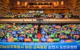 [AI 호남뉴스]순천시는 전라남도와 함께 3일 순천문화예술회관에서 전남광주특별시 행정·교육 통합 도민 공청회를 개최하고, 통합 추진의 방향과 핵심 과제를 시민과 함께 논의했다. 이날 행사에는 노관규 순천시장을 비롯해, 김영록 전라남도지사, 김대중 전라남도교육감, 강형구 순천시의회 의장, 허동균 순천교육지원청 교육장, 지역 사회단체 관계자와 시민 등 1,000여 명이 참석해 전남·광주 통합에 대한 높은 관심을 보였다. 공청회는 노관규 순천시장의 환영사를 시작으로, 김영록 도지사의 전남·광주 행정통합 추진 방안 설명, 김대중 교육감...