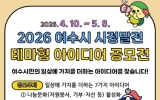 광주광역시 박인석 기자2026. 04.09[AI 호남뉴스]여수시는 시민들의 참신하고 창의적인 의견을 정책에 반영해 ‘시민이 참여하는 시정’을 실현하고자 오는 4월 10일부터 5월 8일까지 ‘2026년 여수시 시정발전 테마형 아이디어 공모전’을 실시한다고 밝혔다. 이번 공모전은 ‘일상에 가치를 더하는 7가지 아이디어’라는 주제로, 시민 생활과 밀접한 현안들에 대한 해결 방안을 발굴하기 위해 마련됐다. 공모 분야는 시민 삶의 질을 높일 수 있는 7개 분야로 ▲나눔문화(자원봉사, 기부 등) 활성화 ▲1회용품 사용감량 ▲불법 옥외광고물 정비 및 활용 ▲자전거 이용 활성화 ▲지...
