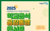 전라북도도 박인석 기자2025. 11.17[뉴스채널] 전북특별자치도교육청이 학교급식에 대한 교육공동체의 다양한 의견을 수렴하는 시간을 가졌다. 전북교육청은 17일 오후 2시 전주 치명자산성지 평화의전당에서 학생·학부모·교직원 등 교육공동체 100여 명이 함께하는 ‘2025. 학교급식 공감동행 콘서트’를 개최했다. 이 행사는 학교급식 정책 및 현안에 대해 학생과 학부모는 물론 교직원까지 다양한 현장 의견을 수렴해 현장 적합성이 높은 학교급식 정책을 수립하기 위해 마련됐다. 주요 내용으로는 학교급식 정책방향 설명과 외부 전문가 특강, 전문 퍼실리테이터와 함께하...
